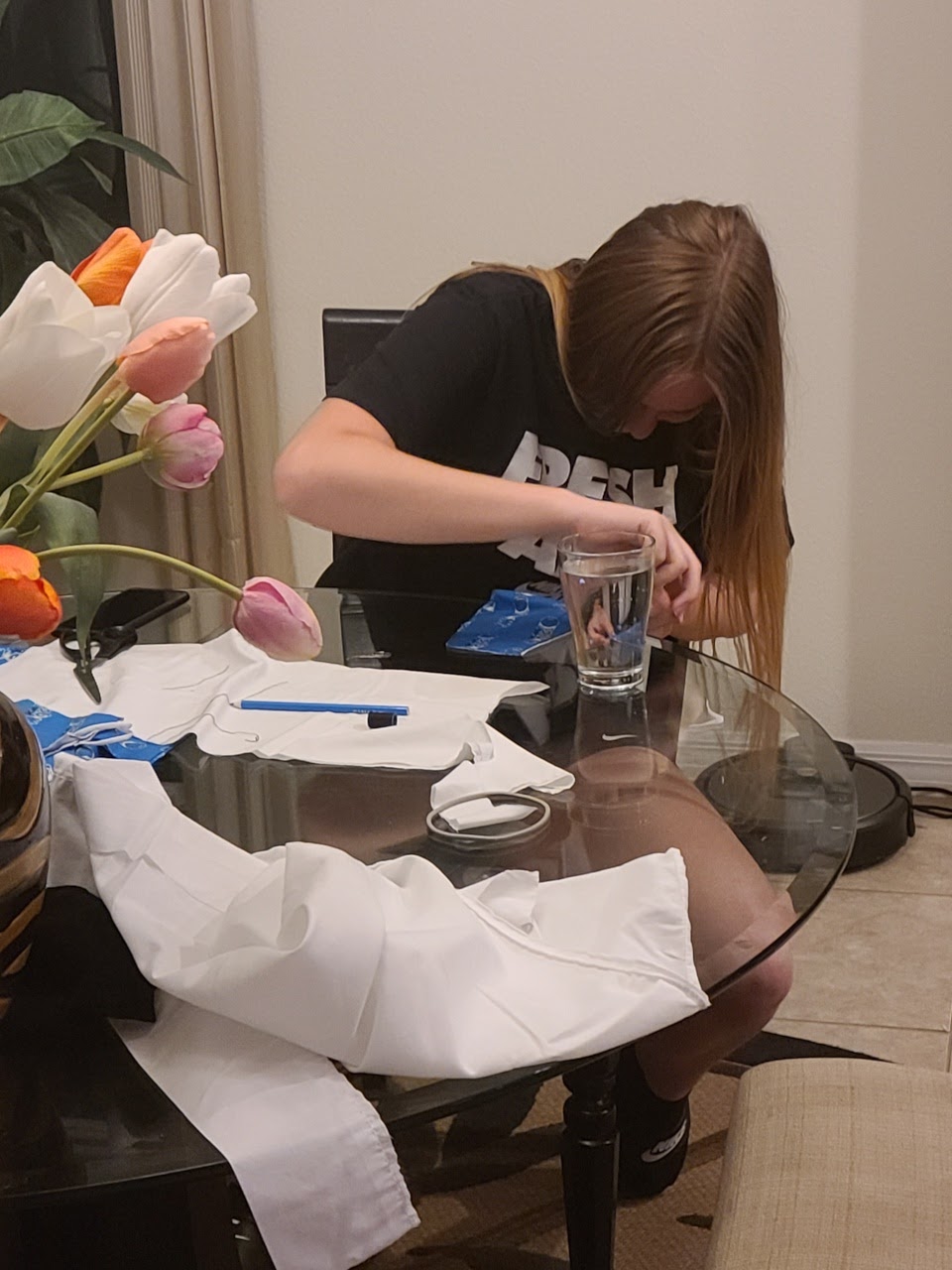 En hierbij nog wat foto's van Michelle die creatief bezig is met het maken van een mondmasker, Coco vindt het ontzettend gezellig maar is niet bepaald de beste hulp 😆. 's Morgens was ze bezig met een t-shirt en Coco vond het ontzettend leuk om op haar stof te gaan liggen en te gaan spelen met een klosje garen!